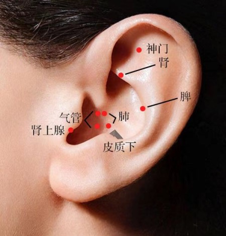 (1)耳针:取肺、脾、肾、气管、神门、肾上腺、皮质下,每次选2~3穴,毫针刺,外感者用较强刺激,内伤者用弱刺激。也可用贴压法。如下图